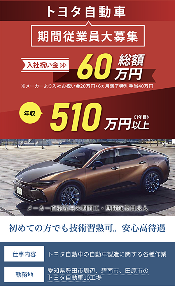 そんな疑問をお持ちの方に向けて、トヨタ期間工の給料や仕事内容・実態をまとめました。