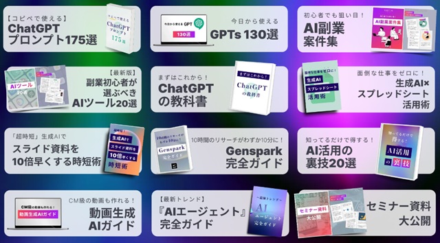 セミナー参加後には特典として、AIに関する書籍・AIを使った副業の始め方に関するガイドブック(全てPDF形式)などが受け取れます。