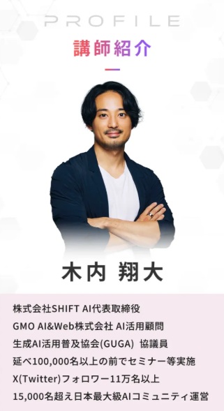 最大の魅力は、Xのフォロワー11万人以上、15,000名越えの日本最大級AIコミュニティを運営する「木内翔大氏」による講義が受けられること。