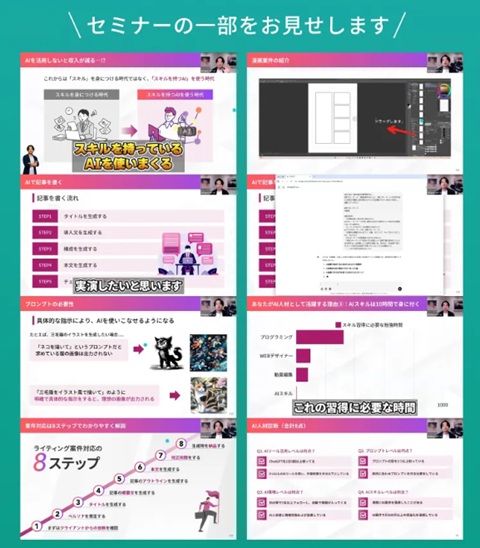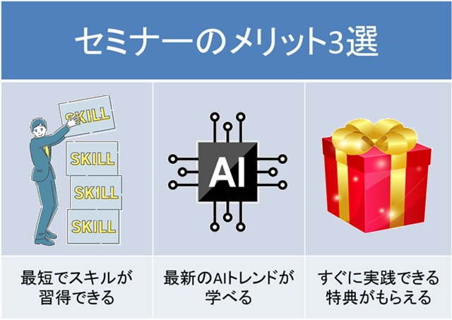 一方でセミナーなら、AIの専門講師が「最新のトレンド」「成功事例」を交えながら、今すぐ実践できるスキルを分かりやすく解説してくれます。
