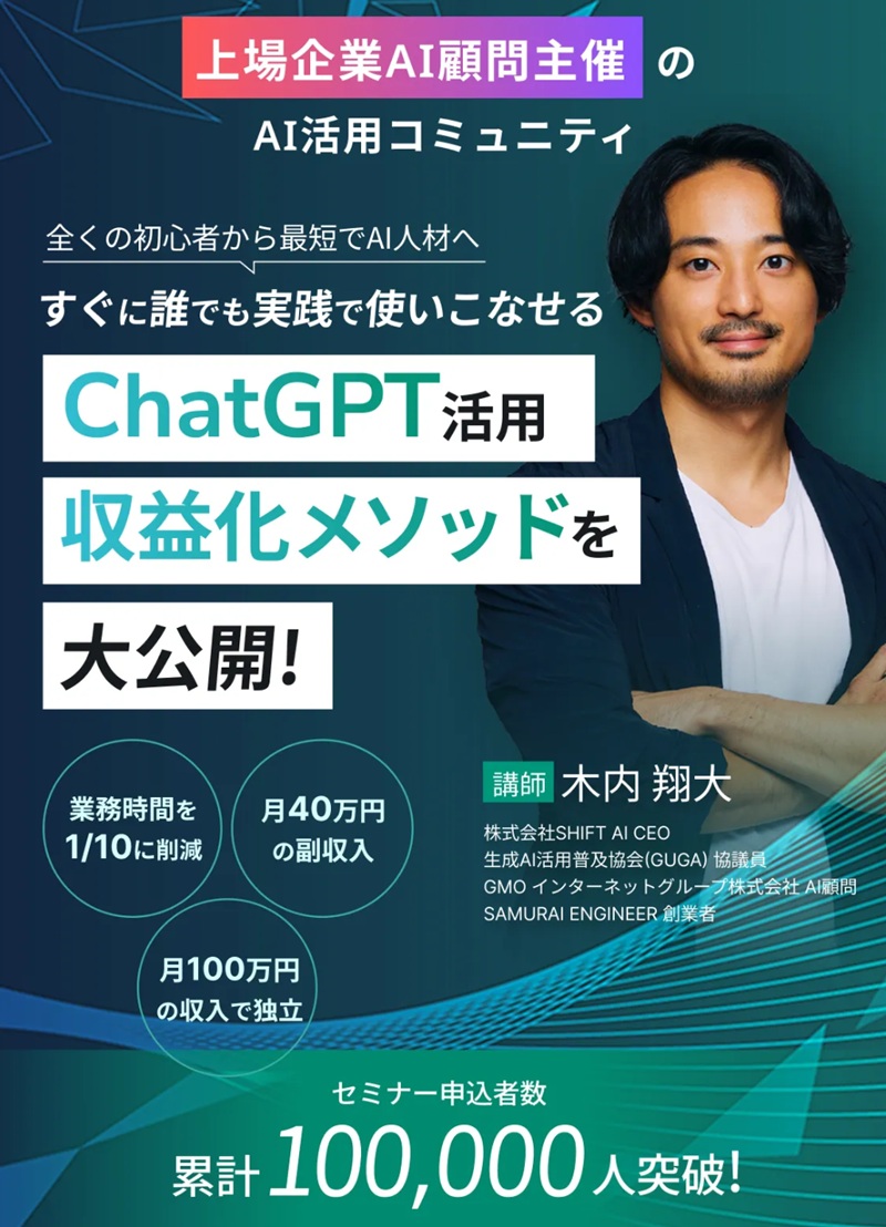 最大の魅力は、Xのフォロワー11万人以上、15,000名越えの日本最大級AIコミュニティを運営する「木内翔大氏」による講義が受けられること。
