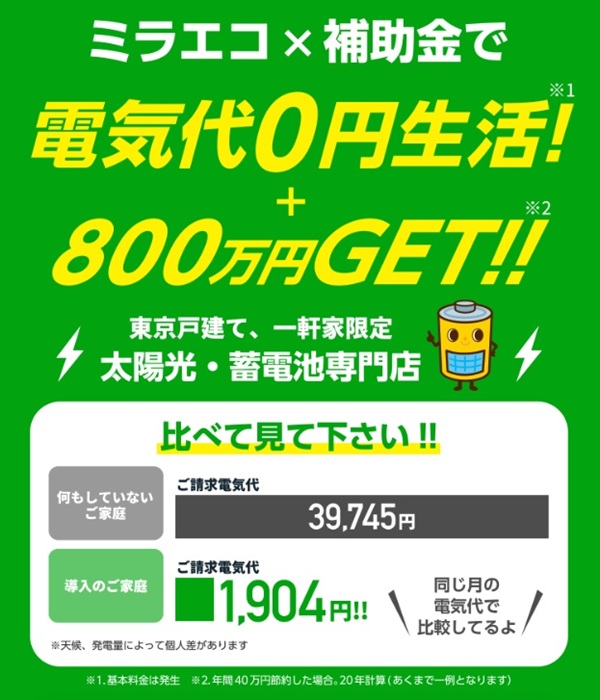 ミラエコは、累計3,000件以上の導入実績を誇る太陽光発電・蓄電池の設置業者です。