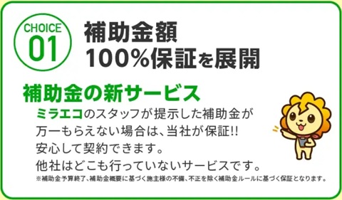 ミラエコでは、スタッフが提示した補助金が万が一もらえなかった場合に「補助金額100%」を保証する独自の制度※を導入しています。